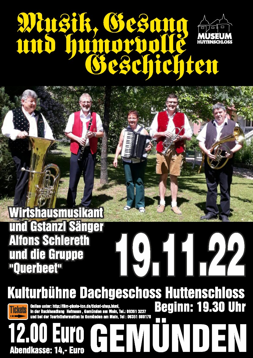 Wirtshausmusikant und Gstanzl-Sänger Alfons Schlereth und die Gruppe „Querbeet“ treten bei einem fränkischen Abend unter dem Motto „Musik, Gesang und humorvolle Geschichten“ am Samstag, 19. November, um 19.30 Uhr zusammen auf der Kulturbühne im Dachgeschoss des Huttenschlosses in Gemünden auf.